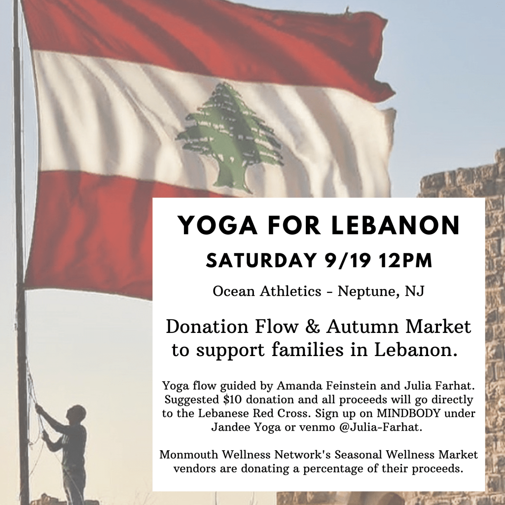 Yoga flow guided by Amanda Feinstein and Julia Farhat. Suggested $10 donation and all proceeds will go directly to the Lebanese Red Cross. Sign up on here or venmo @Julia-Farhat.
